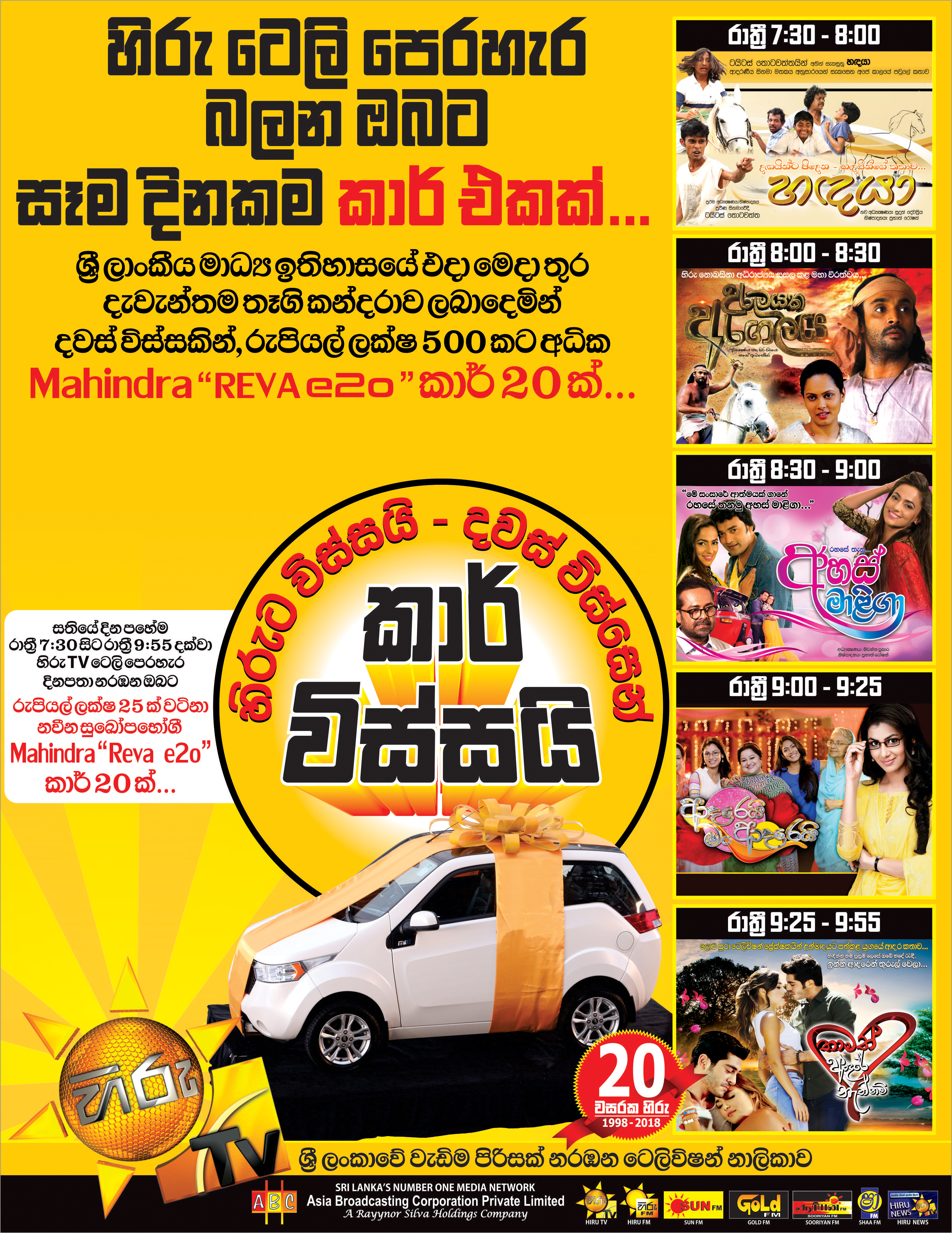 සතියේ දින පහේම රාත්රී 7.30සිට රාත්රී 9.55 දක්වා හිරු TV ටෙලිපෙරහැර දිනපතා නරඹන ඔබට රුපියල් ලක්ෂ 25ක් වටිනා නවීන සුඛෝපභෝගී Mahindra “REVA e20” කාර් 20ක්…